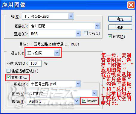 1、打开原图素材,把背景图层复制一层,执行:图像 > 应用图像,参数设置如下图。这一步操作目的是强化天空明暗对比。