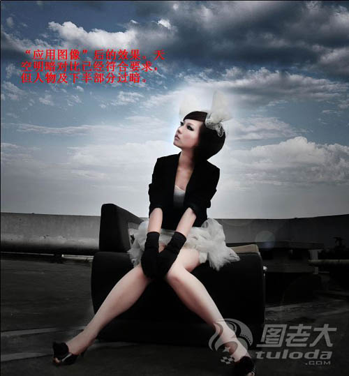 应用图像后的效果如下图,天空明暗对比已经符合要求,淡人物及地面部分过暗。