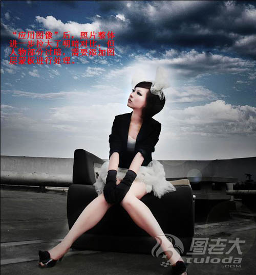 应用图像后,照片整体进一步拉大了明暗对比,但人物部分过暗,需要添加图层蒙版进行处理。