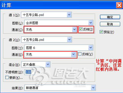 执行:图像 > 计算,计算中间调选区,参数及效果如下图。