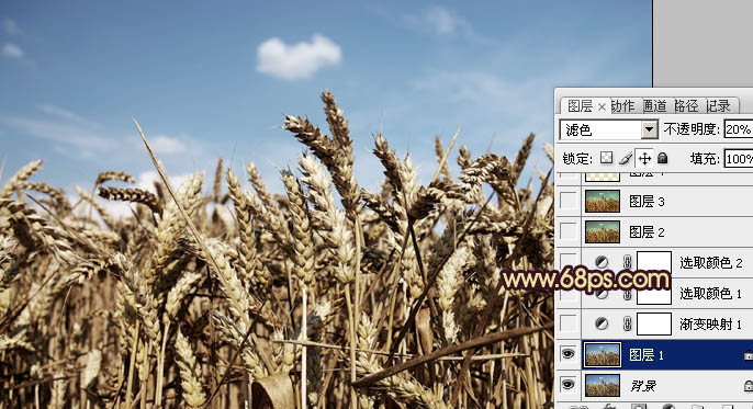 1、打开原图素材,按Ctrl + J 把背景图层复制一层,图层混合模式改为“滤色”,不透明度改为:20%,效果如下图。