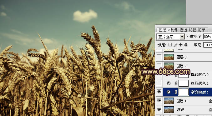 2、创建渐变映射调整图层,颜色设置如图2,确定后把图层混合模式改为“正片叠底”,不透明度改为:80%,效果如图3。