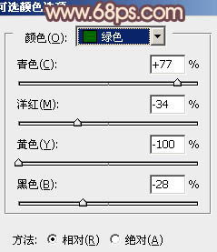 8、创建可选颜色调整图层,对黄,绿进行调整,参数设置如图13,14,效果如图15。
