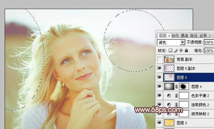 11、新建一个图层,图层混合模式改为“滤色”,把前景颜色设置为:#BD8CB9,用画笔把下图选区部分涂上高光。