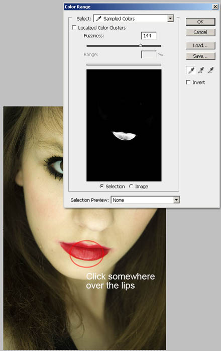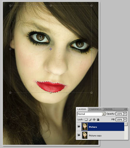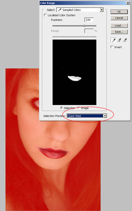 你可以改变“选区预览”,看看选区的形状。最后单击确定时你会获得一个关于嘴唇的选区。选中“图”层,下一步。