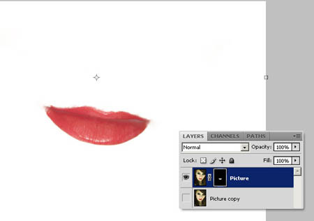 3、不要取消选区,“图层”-图层蒙版-隐藏所有,然后用白色(#FFFFFF)填充选区。这样,嘴唇可见,脸的其余部分将隐去。(译者注,直接点击图层面板上的蒙版按钮就可以了。不要去菜单里找啊找……)
