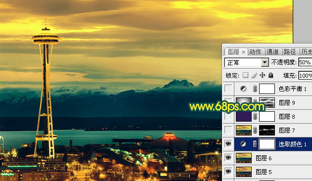 10、新建一个图层,盖印图层。选择菜单:图像 > 模式 > RGB颜色,确定后创建可选颜色调整图层,对黄,绿进行调整,参数设置如图15,16,确定后把图层不透明度改为:50%,效果如图17。