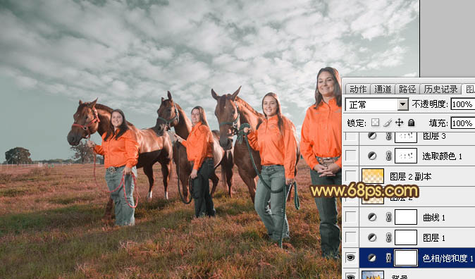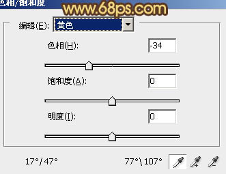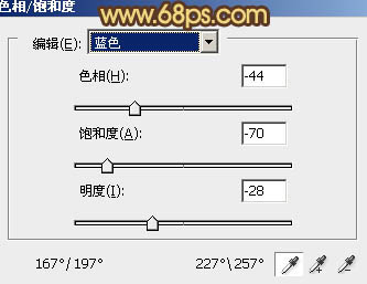 1、打开原图素材,创建色相/饱和度调整图层,选择黄色,用吸管吸取草地的颜色再调整,参数设置如图1。确定后选择蓝色,用吸管吸取天空部分的颜色再调整,参数设置如图2,效果如图3。