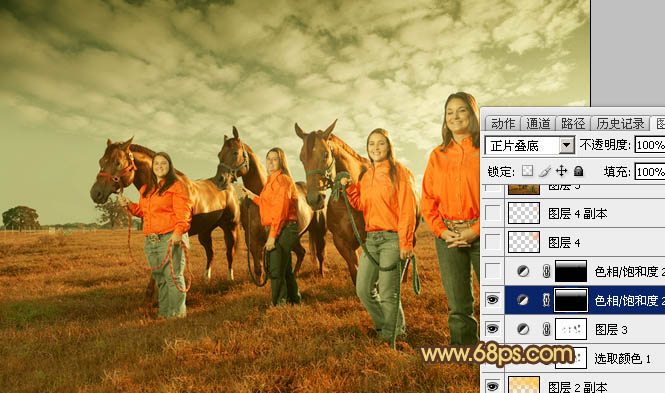 8、创建色相/饱和度调整图层,对黄色进行调整,参数设置如图14,确定后把图层混合模式改为“正片叠底”,选择渐变工具,由上至下拉出白色至黑色线性渐变,效果如图15。