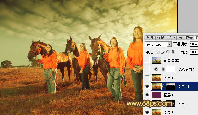 12、新建一个图层,盖印图层,图层混合模式改为“正片叠底”,不透明度改为:20%,加上图层蒙版,只保留天空部分,其它部分用黑色画笔擦出来,如下图。