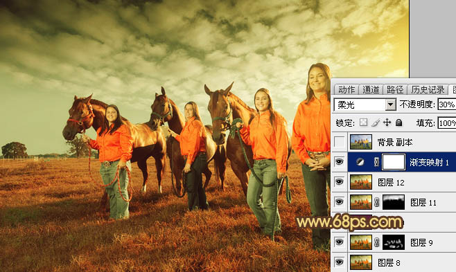 13、创建渐变映射调整图层,颜色设置为黑白,如图20,确定后把图层混合模式改为“柔光”,不透明度改为:30%,效果如图21。