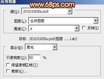 5、新建一个图层,按Ctrl + Alt + Shift + E 盖印图层。选择菜单:图像 > 模式 > Lab颜色,确定后执行:图像 > 应用图像,参数设置如图12,效果如图13。