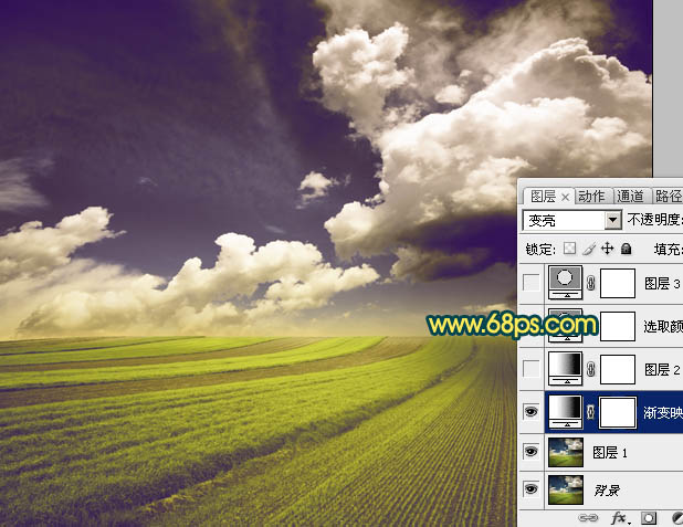1、打开原图素材,创建渐变映射调整图层,颜色设置如图1,确定后把图层混合模式改为“变亮”,效果如图2。