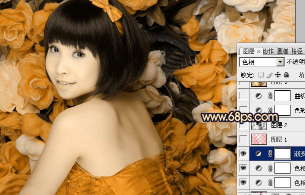 3、创建渐变映射调整图层,颜色设置如图5,确定后把图层混合模式改为“色相”,效果如图6。