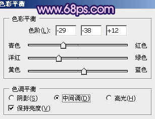 2、创建色彩平衡调整图层,对阴影,中间调,高光进行调整,参数设置如图5,6,7。确定后把图层不透明度改为:60%,用黑色画笔把人物肤色部分擦出来,效果如图8。