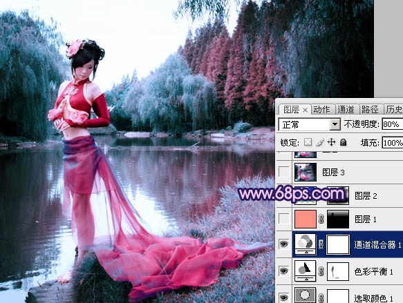 3、创建通道混合器调整图层,对蓝色通道进行调整,参数设置如图9,确定后把图层不透明度改为:80%,效果如图10。