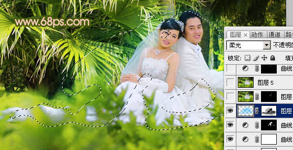 5、新建一个图层,图层混合模式改为“柔光”,把前景颜色设置为:#05BEF4,用画笔把图11所示的选区部分涂上淡淡的青色,效果如图12。
