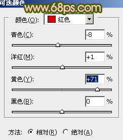 13、对当前肤色图层执行:图像 > 调整 > 可选颜色,对红色进行调整,参数设置如图20,确定后再适当降低图层不透明度,效果如图21。
