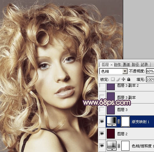 4、创建渐变映射调整图层,颜色设置如图5,确定后把图层混合模式改为“色相”,不透明度改为:60%,效果如图6。