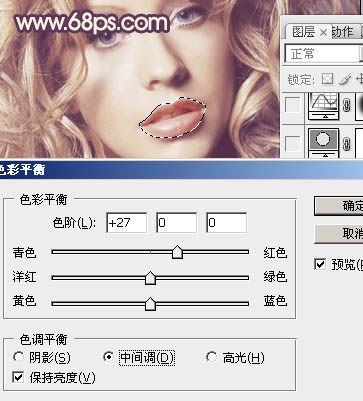 7、用钢笔工具把人物嘴巴部分抠出来,转为选区后创建色彩平衡调整图层,稍微调红一点,参数设置如下图。