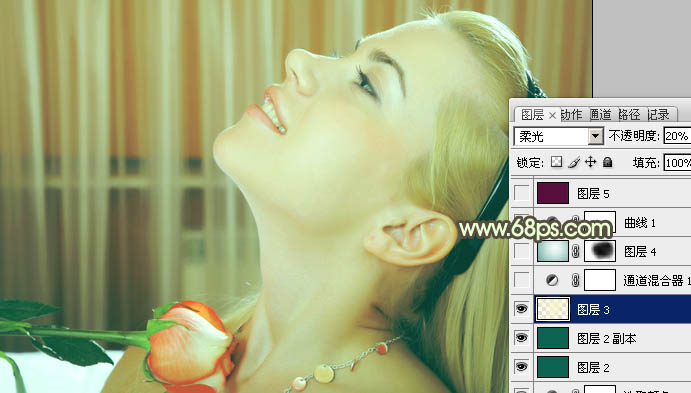 5、按Ctrl + Alt + ~ 调出高光选区,新建一个图层填充颜色:#F9F5CD,图层混合模式改为“柔光”,不透明度改为:20%,效果如下图。
