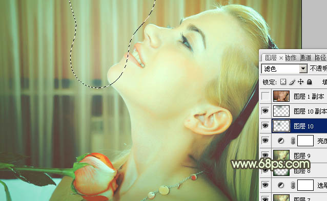 13、新建一个图层,图层混合模式改为“滤色”,把前景颜色设置为:#0E544D,用画笔把下图选区部分涂上高光。