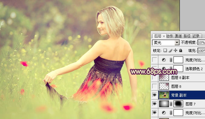 11、把背景图层复制一层,按Ctrl + Shift + ] 置顶,图层混合模式改为“柔光”,不透明度改为:10%,效果如下图。