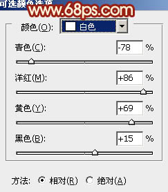 1、打开原图素材,创建可选颜色调整图层,对白色及中性色进行调整,参数设置如图1,2,确定后用黑色画笔把人物部分擦出来,效果如图3。