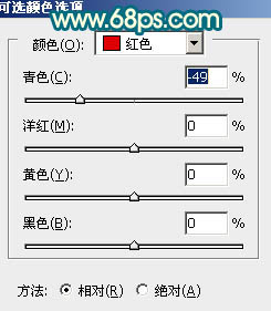 6、新建可选颜色调整图层,对红,黄进行调整,参数设置如图12,13,效果如图14。