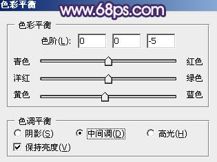 4、创建色彩平衡调整图层,对中间调及高光进行调整,参数设置如图7,8,效果如图9。
