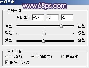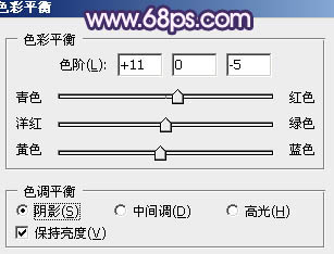 6、用钢笔把人物裙子部分抠出来,转为选区后创建色彩平衡调整图层,对阴影及中间调进行调整,参数设置如图12,13,效果如图14。