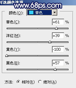 2、创建可选颜色调整图层,对青色进行调整,参数设置如图4,效果如图5。