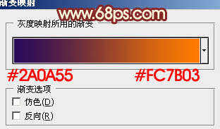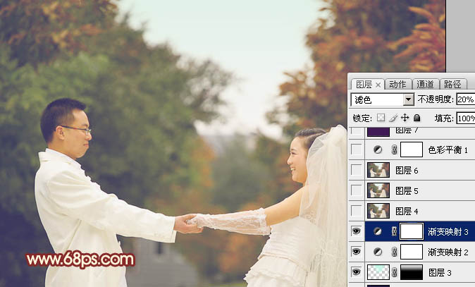 8、创建渐变映射调整图层,颜色设置如图14,确定后把图层混合模式改为“滤色”,不透明度改为:20%,效果如图15。