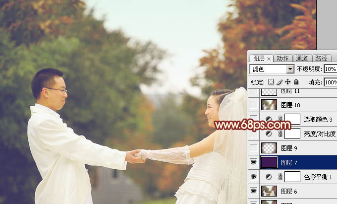 11、新建一个图层,填充颜色:#401A55,图层混合模式改为“滤色”,不透明度改为:10%,效果如下图。
