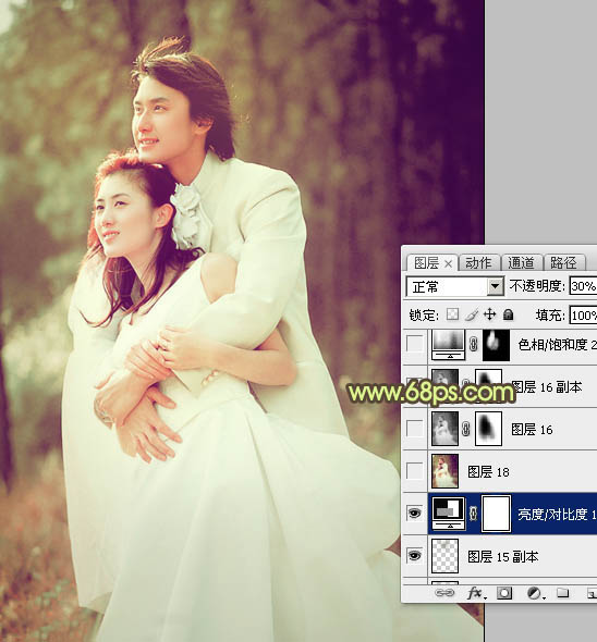 12、创建亮度/对比度调整图层,参数设置如图18,确定后把图层不透明度改为:30%,效果如图19。