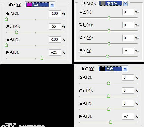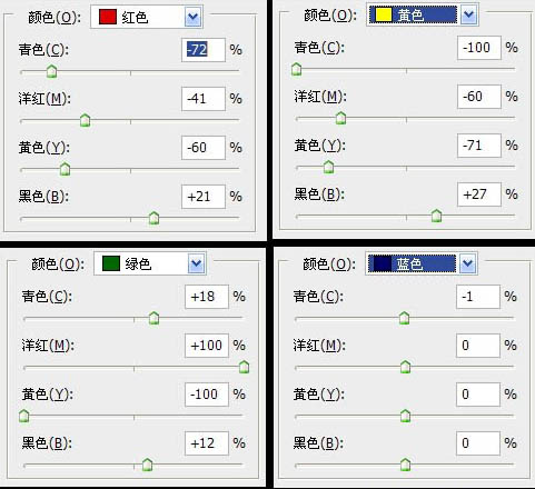 2、创建可选颜色调整层,分别对红色,黄色,绿色,蓝色,洋红,中性色,黑色进行调整,参数及效果如下图: