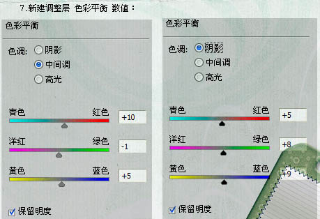 7、新建色彩平衡调整图层,对中间调及阴影调整,参数设置如下图。