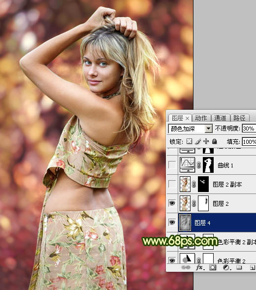 7、新建一个图层,盖印图层,执行:滤镜 > 模糊 > 高斯模糊,数值为5,确定后按Ctrl + Shift + U 去色,图层混合模式改为“颜色加深”,不透明度改为:30%,效果如下图。