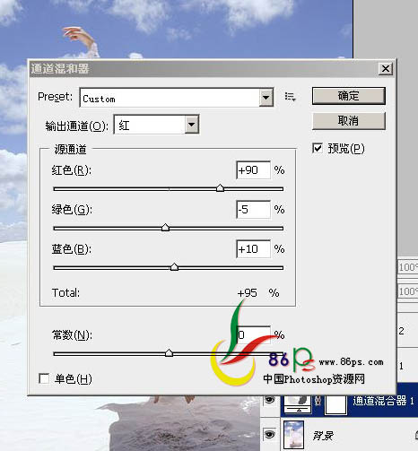 1、打开原图,建通道混合器调整层,调整红和蓝通道,参数及效果如下:
