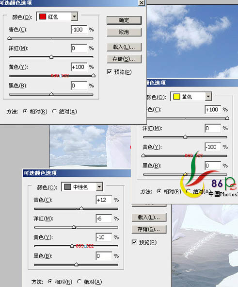 3、再建可选颜色,调整红色、黄色、中性色,参数及效果如下: