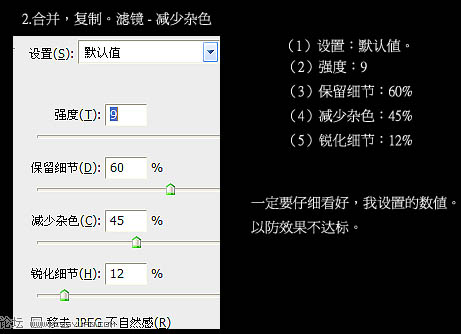 2、新建一个图层,按Ctrl + Alt + Shift + E 盖印图层。执行:滤镜 > 杂色 > 减少杂色,数值:强度为:9;保留细节为:60%;减少杂色为:45%;锐化细节为:12%。