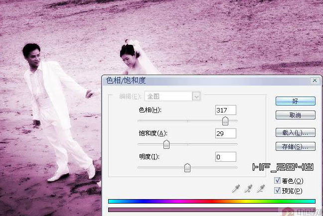 有一个方向后那就好办了,执行"图层-新调整图层-色相/饭度",把"着色"选项打勾。添加一个调整图层。为什么要用调整图层呢?这是因为后面我们还要利用调整层旁的蒙板来突出主体人物,往下看就知道了。
