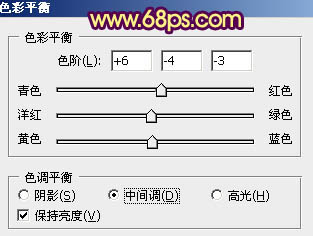 6、按Ctrl + B 调整色彩平衡,对中间调及高光进行调整,参数设置如图19,20,效果如图21。