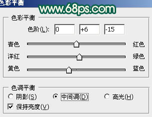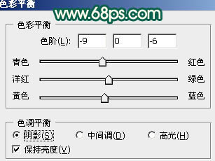 5、创建色彩平衡调整图层,对暗调,中间值,高光进行调整,参数设置如图16 - 18,效果如图19。