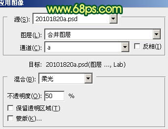 15、新建一个图层,盖印图层。选择菜单:图像 > 模式 > Lab颜色,选择不合拼。确定后执行:图像 > 应用图像,参数设置如图26。