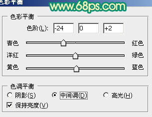 15、创建色彩平衡调整图层,参数设置如图33,确定后把背景部分擦出来,效果如图34。