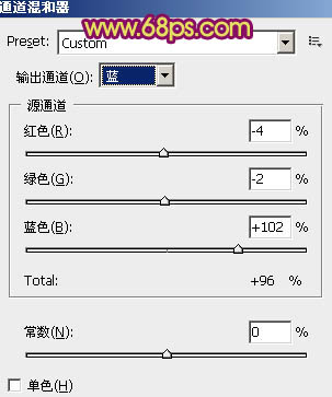 9、创建通道混合器调整图层,对蓝色调整,参数设置如图23,效果如图24。