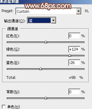 16、创建通道混合器调整图层,对蓝色进行调整,参数设置如图33,确定后把图层不透明度改为:30%,效果如图34。