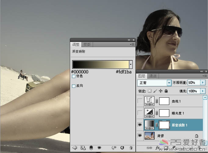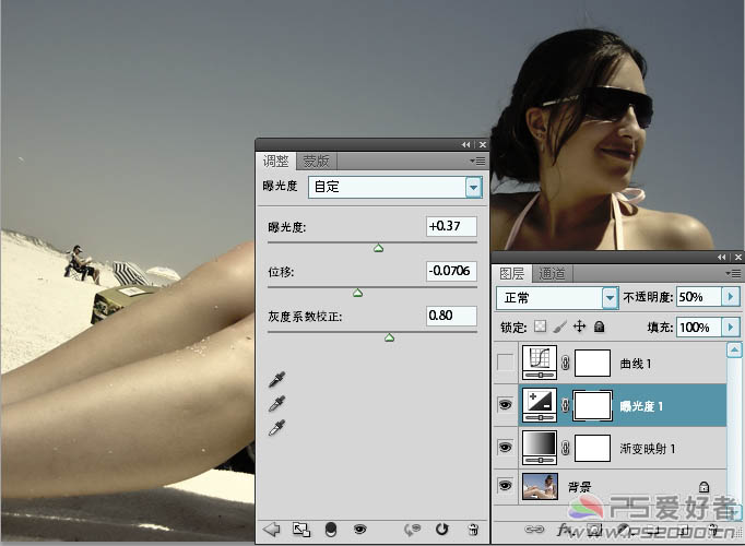 2、添加“曝光度”调整图层,设置如下。图层不透明度调整为50%。