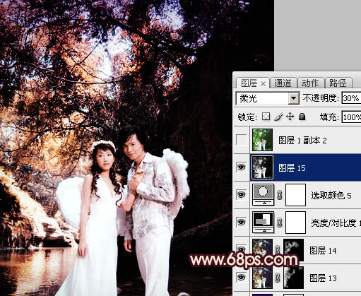 12、新建一个图层,盖印图层。按Ctrl + Shift + U 去色,图层混合模式改为“柔光”,图层不透明度改为:30%,效果如下图。